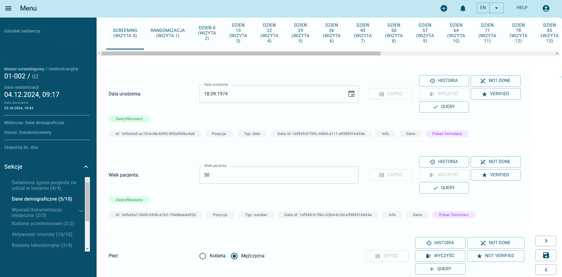The data entry form structure is fully editable and tailored individually based on the study protocol. Its layout allows for quick and efficient data input, saving, and editing of form elements in minimal time. The patient randomization process is intuitive and clearly marked within the form, significantly streamlining patient enrollment and group allocation.