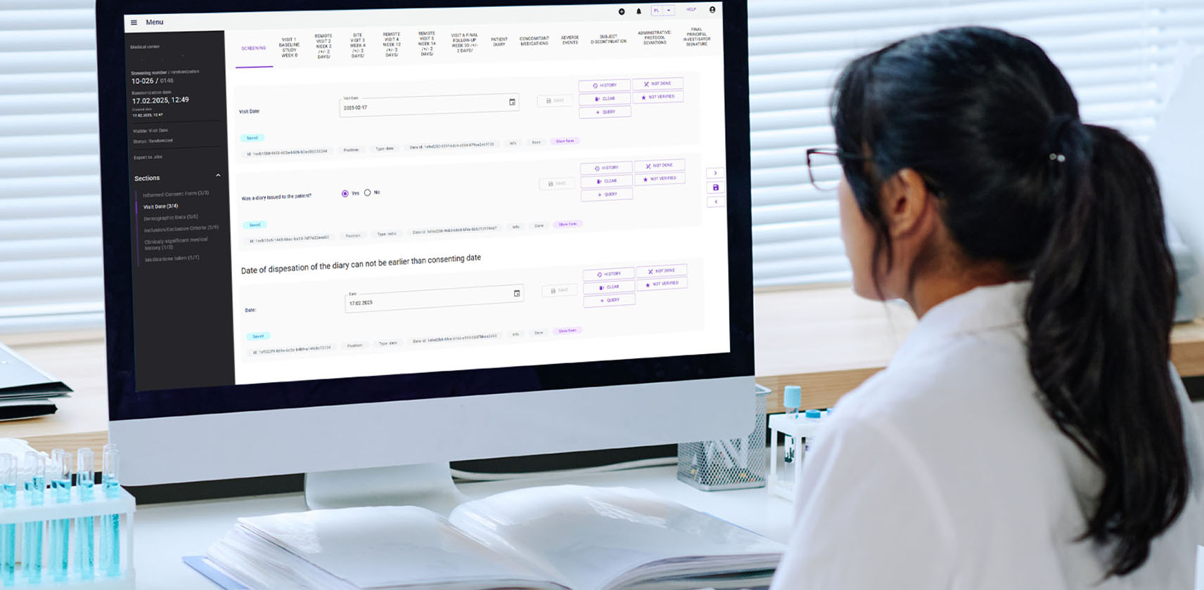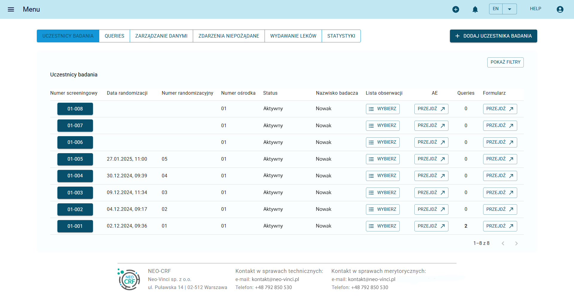●Clean and transparent arrangement of elements in table form, ●Flexible configuration of displayed data, ●Statistical data export function, ●Advanced filters, ●Simple tracking of enrollment status by site.