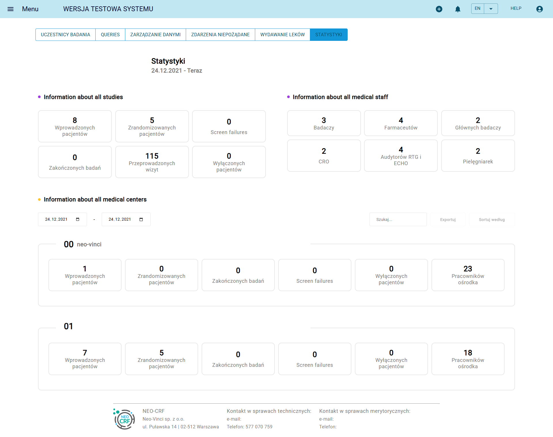 The system enables real-time viewing of clinical trial progress statistics. This view is accessible to specific system users or by user roles, with the option to filter statistics for a single research site or all active study sites. With the use of advanced filters, users can access detailed statistics such as patient counts, randomization numbers, cohort compositions, team configurations, and visit records at clinical sites.